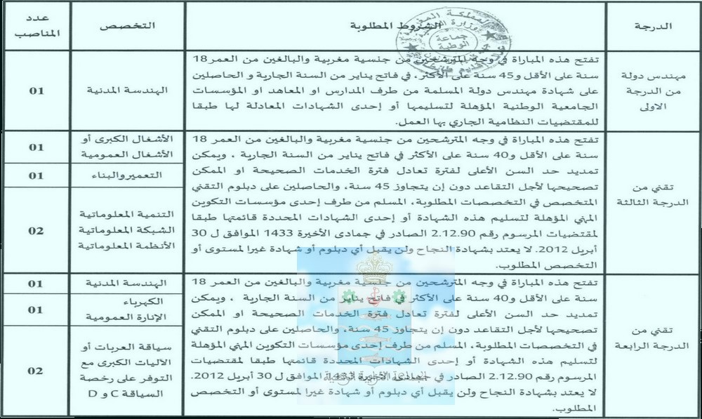 تُعلن جماعة الوطية الواقعة في إقليم طانطان، جهة كلميم – واد نون، عن تنظيم مباراة للتوظيف لشغل 9 مناصب في درجات مهندسين و تقنيين من الدرجة الثالثة والرابعة. يهدف هذا الإعلان إلى توظيف كفاءات في عدة تخصصات وفقًا للمعايير التالية.